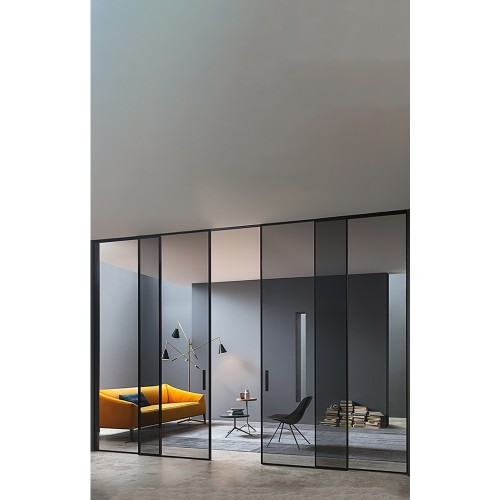 درب داخلی کشویی Shoin برند Lualdi با فریم آلومینیومی نازک و پنلهای شیشهای، سیستم انعطافپذیر ایجاد دیوار داخلی است و نور طبیعی را به حداکثر میرساند.